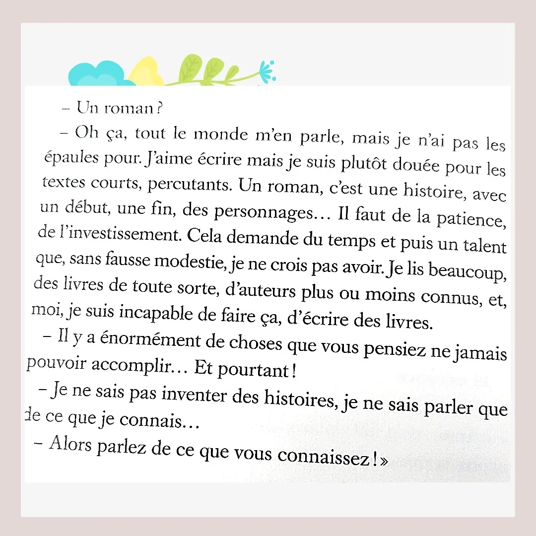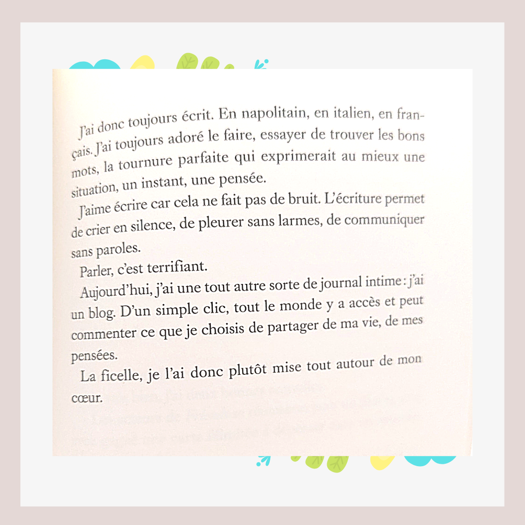 đđđ Ce bouquin a Ă©tĂ© pour moi l’ultime dĂ©clic, le dĂ©clic dont j’avais besoin pour enfin commencer Ă Ă©crire mon roman. ( Je n’ai pas encore commencer mais cette semaine c’est la bonne đ) Je lis Ă©normĂ©ment et j’Ă©cris Ă la volĂ©e, avec le cĆur mais je n’ai jamais franchi le pas, pourtant, l’envie y est. Je lis tellement de magnifiques romans que j’ai peur de paq Ă©crire aussi bien… merci Ă l’auteure d’ĂȘtre ma Virginie Grimaldi et de m’avoir inspirĂ© autant ! J’en ai versĂ© des larmes lors de la lecture de votre roman. Il m’a tellement bouleversĂ©, bousculĂ© et donnĂ© la derniĂšre impulsion pour avancer. Merci đ