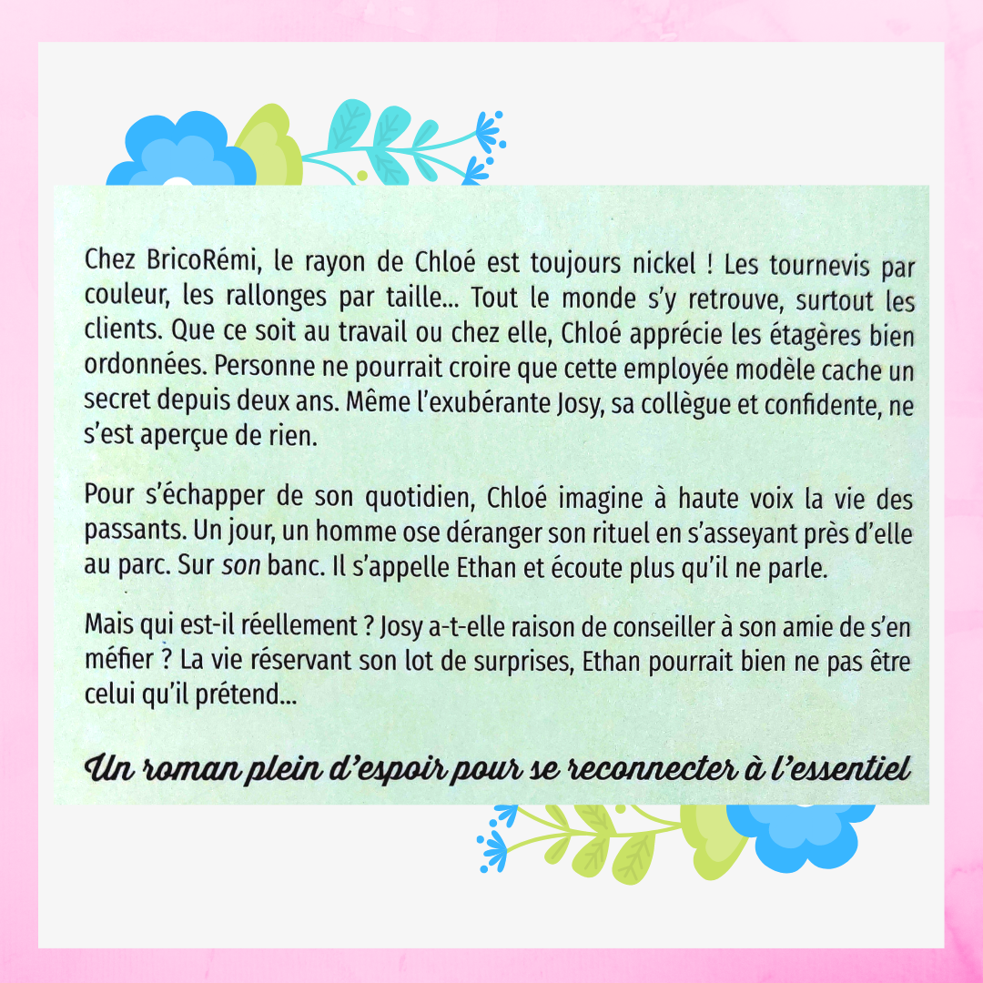 đŽ Un jour, ChloĂ© va rencontrer, sur un banc, Ethan… cette rencontre va bouleversĂ© sa vie et lui apporter tellement. Ses Ă©changes avec lui sont si enrichissants… elle apprend Ă voir la vie et, sa vie surtout, sous un autre angle ! Elle va cheminer pas Ă pas, vers son SOI, vers son SOI IntĂ©rieur qu’elle avait longtemps occultĂ©… comment est-elle arrivĂ© lĂ ? Certes, sa rencontre avec un inconnu la pertube un peu, mais Ethan lui apporte tellement !