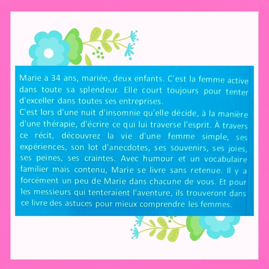đ±C’est ma 3e lecture de l’autrice et je peux vous dire que je ne m’en lasse pas ! J’ai donc pris beaucoup de plaisir Ă entrer dans la vie de Marie. Marie c’est toi, c’est vous, c’est nous !