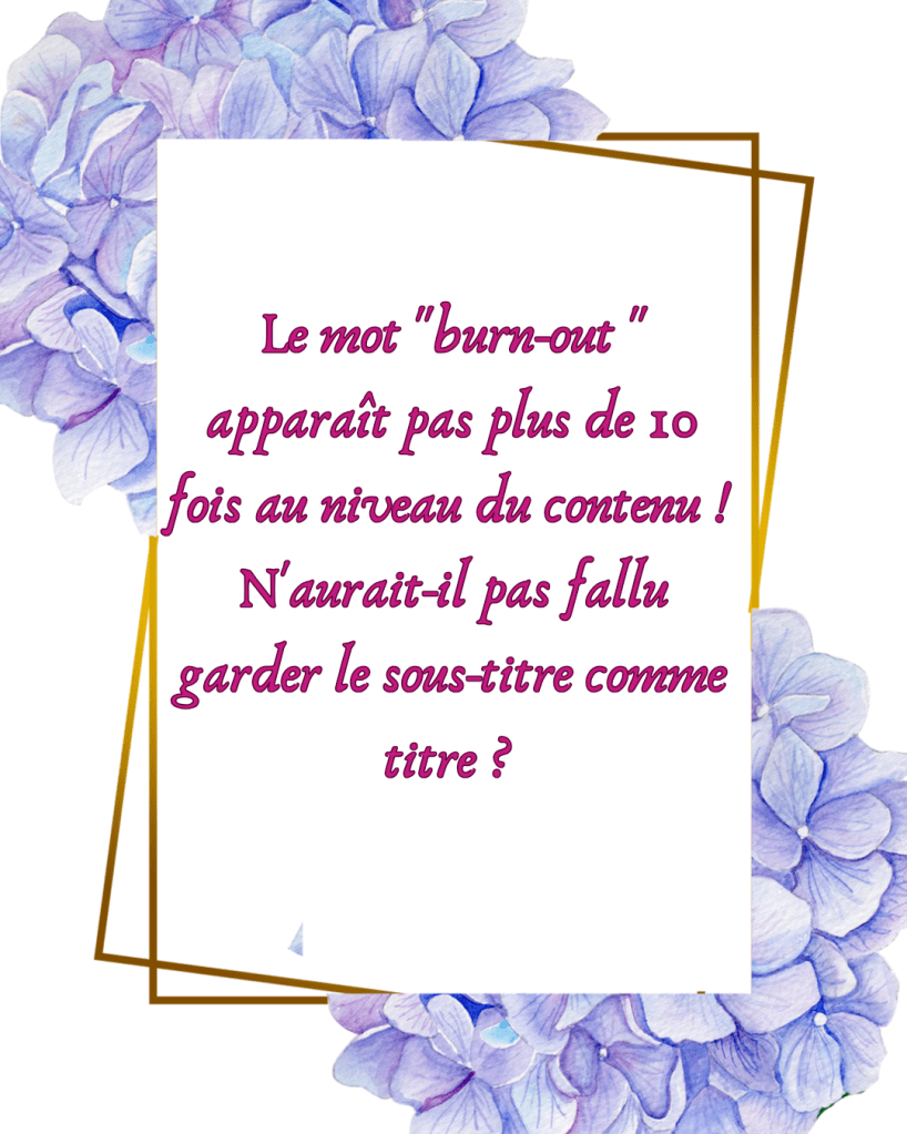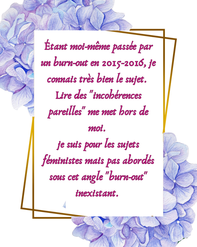 Pourquoi je l’ai achetĂ© selon toi? Pour lire ce qu’elles avaient Ă©crit en rapport avec le burn-out. Sujet que je connais en profondeur pour l’avoir vĂ©cu et Ă©galement, pour m’ĂȘtre documentĂ©e de toutes les maniĂšres qui soient (livrĂ©es, Ă©tudes, documentaires tv, confĂ©rences, tĂ©moignages… et j’en passe)