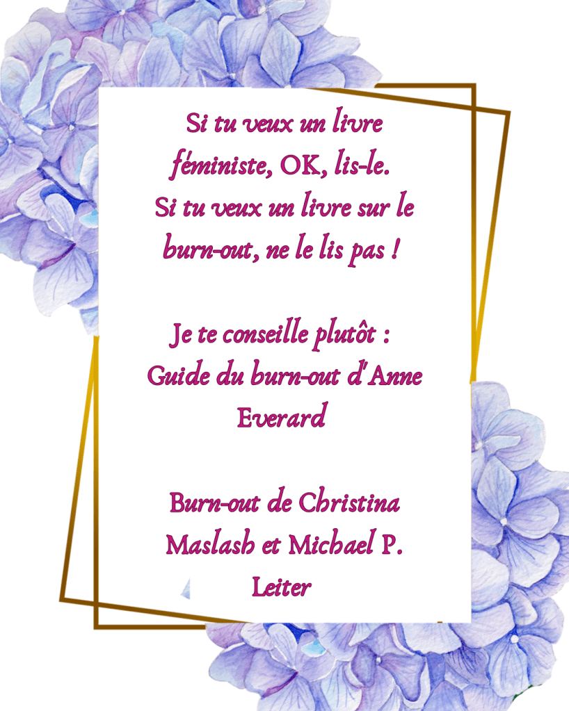 đĄ Ce livre est fĂ©ministe. Point. Et c’est ok pour moi. Mais chaque lien qui est fait avec le burn-out n’est que superficiel.