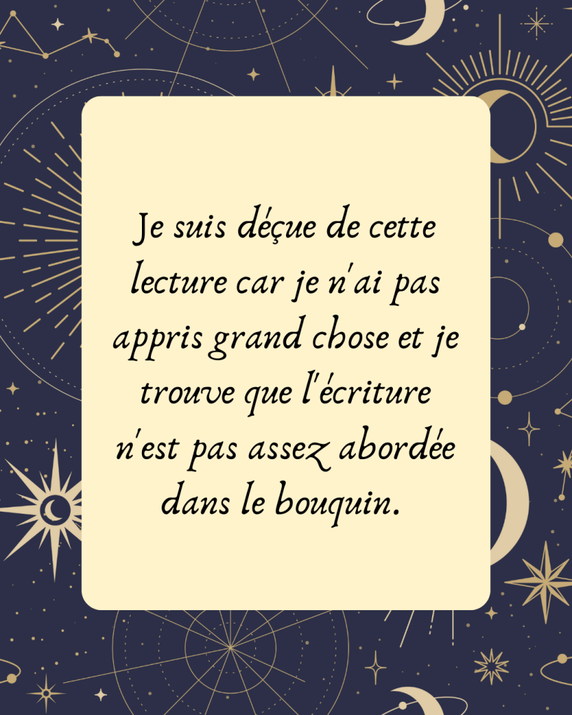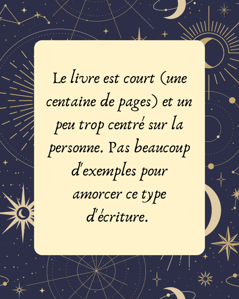 đ Arrive alors le chapitre sur l’Ă©criture inspirĂ©e quantite, le chapitre tant attendu… grosse dĂ©ception. L’autrice nous explique sa mĂ©thode et uniquement sa mĂ©thode. Il n »y a pas de recettes miracles pour se connecter Ă l’invisible mais elle ne donne que son point de vue. Aucun autre exemple n’est donnĂ©… finalement, on ne sait pas trop comment faire…