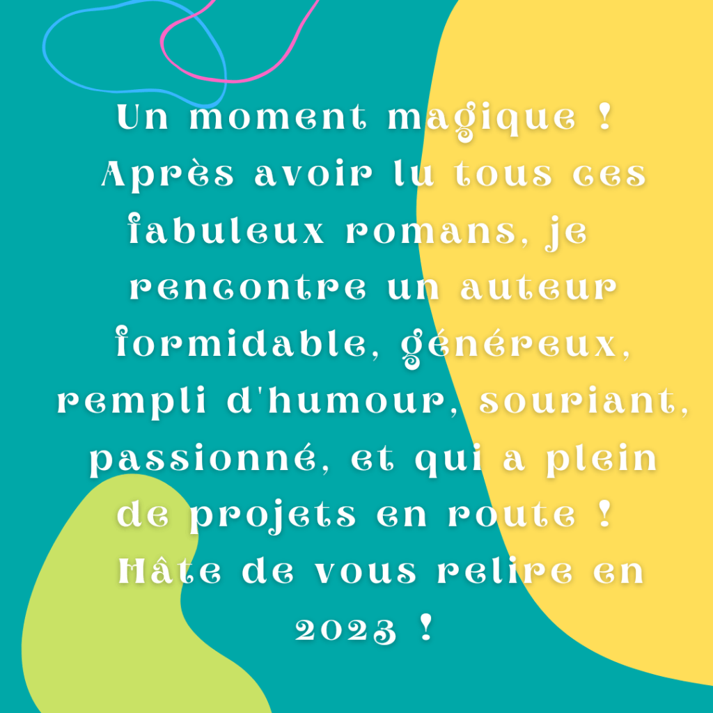 🌟 Je garde un souvenir merveilleux gravé dans mon cœur et mémoire ! Une rencontre et échanges qui me tenaient à cœur ❤️ car rien ne vaut un échange avec l’auteur quand vous avez lus tous ces livres. Ses romans qui vous ont fait pleurer rire, réfléchir mais surtout passer un très bon moment.