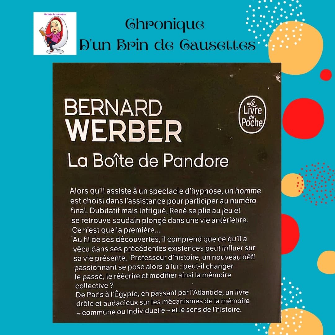 Hello les amis ! Quel plaisir de partager avec vous cette puissante lecture ! Wouaw wouaw wouaw ! C’est mon premier roman de cet auteur et j’en suis ravie. Que de sujets abordés et, qui me parlent (J’ai littéralement kiffé, passez-moi l’expression) En embarquant pour la Boîte de Pandore, vous découvrirez les aventures de René. Sa vie va basculer le soir où son amie, Émilie, l’invite à un spectacle d’hypnose. Il va plonger dans une de ses vies antérieures… Comment va réagir René ? Est-ce que sa vie va changer ? Est-ce que nous avons vécu dans nos vies antérieures peut influencer notre vie d’aujourd’hui ? Personnellement, j’en suis convaincue et je crois en la réincarnation. Chaque passage sur terre, nous permet d’apprendre ce pour quoi nous sommes là mais aussi, notre contribution au monde. (Vision personnelle, c’est un débat bien sûr) L’écriture est originale, structurée, passionnante, informative, précise, les dialogues sont fluides, plein de suspens aussi. Je n’ai pas vu passer les 563 pages. Ce roman permet de mettre en lumière d’autres points de vue de l’Histoire mais aussi, de notre Histoire. Pourquoi suis-je réincarné dans cette vie ? Vous êtes-vous déjà posé la question ? Quel est votre talent ? Que signifie votre prénom ? Pourquoi j’ai vécu ou je vis toutes ces épreuves que la vie met sur mon chemin ? Je ne sais pas si vous trouverez des réponses dans ce chef d’œuvre mais je m’en suis trouvée une ! La bibliothérapie est partout et vous accompagne 😁🙏 J’ai hâte de lire tous les romans de Bernard Werber ! Et j’espère que vous aussi !
