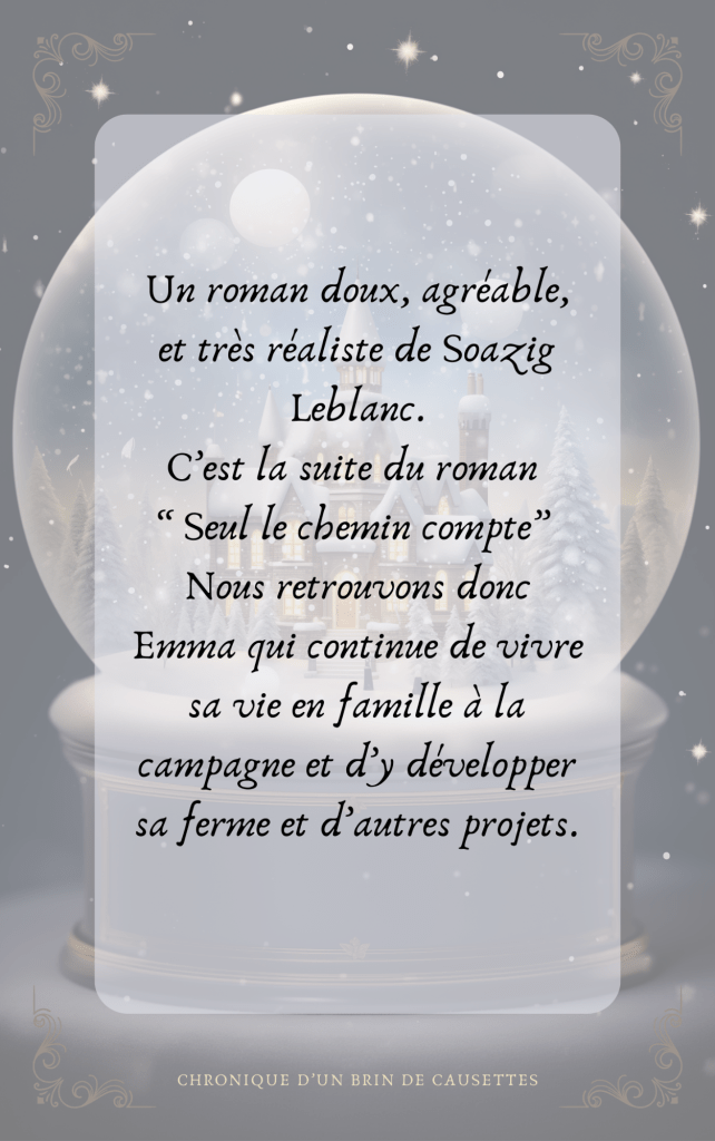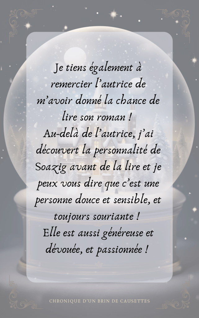 ☃️ Je remercie bien évidemment Soazig de m’avoir fait confiance pour lire et chroniquer son dernier roman. Je la remercie de sa disponibilité, pour son organisation 🙏💪 Merci de m’avoir fait voyager avec Emma, dans la vie de tous les jours, qu’il faut continuer à croire en soi et en ses rêves