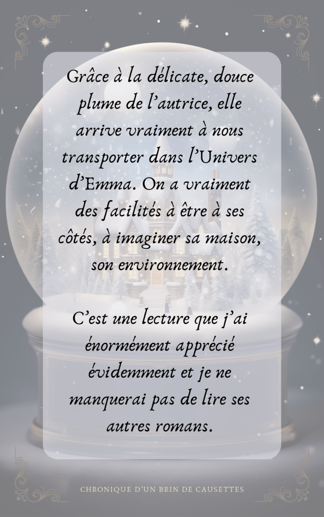❄️ Valentine va changer et évoluer à son contact, elle qui a été beaucoup façonnée par ses parents. Est-ce qu’elle va enfin oser s’affirmer et devenir la femme qu’elle souhaite devenir et faire ses propres choix ? Qu’est-ce que son voyage va lui apporter ? Est-ce qu’elle va rester à Florac ? Tu le sauras en lisant ce merveilleux roman !