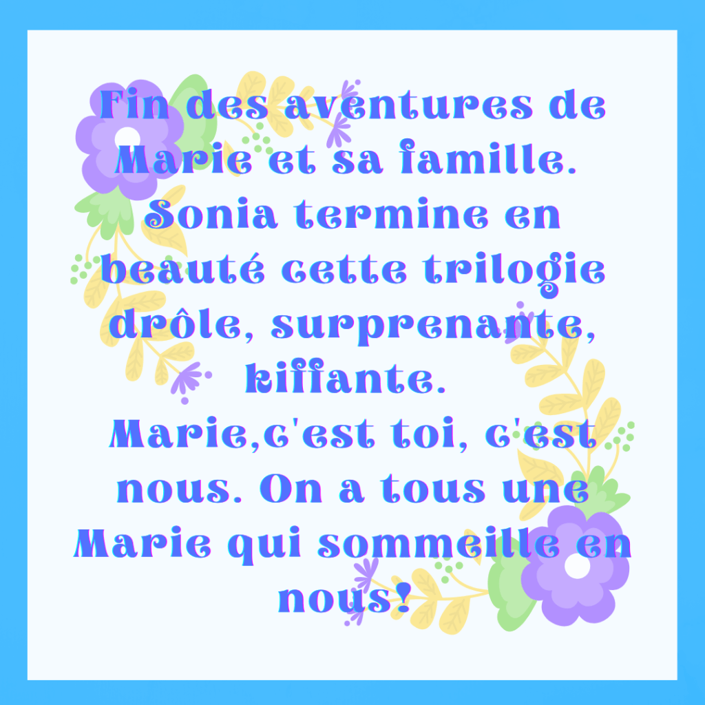 🌟 C’est avec grand regret que je quitte Marie et sa famille à laquelle je me suis attachée et reconnue. Mais pas de panique, je les retrouve bientôt dans de nouvelles aventures grâce à » C’est le pompon » et » A minuit, tout est permis » ! Avoue que je t’ai convaincu de lire ces 3 tomes 😆🤪 n’hésite pas à écrire à Sonia, elle est géniale (tout autant que ses romans! 🥰)